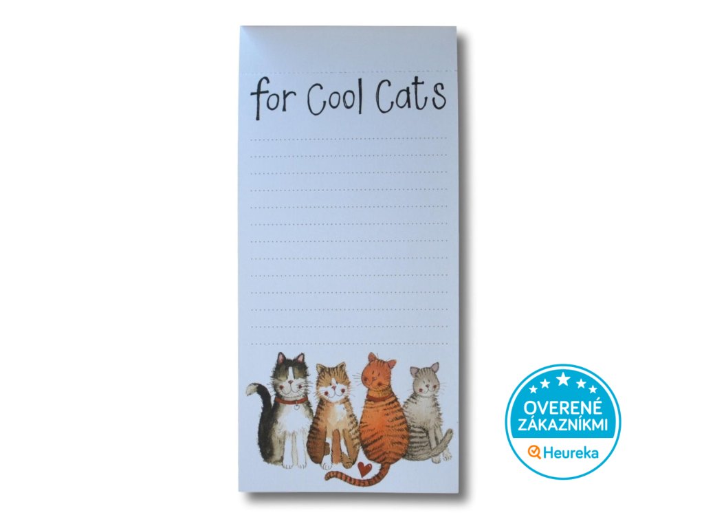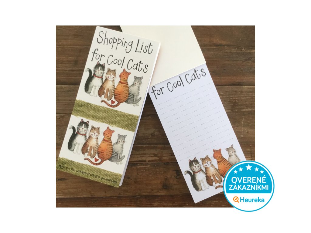 Veľký dizajnový blok so 100 trhacími listami na nákupný zoznam - so silným magnetom na uchytenie na chladničku. Štyri maľované mačky pochádzajú z ateliéru maliarky Alex Clark. Nikdy ste sa na nákupy netešili viac!