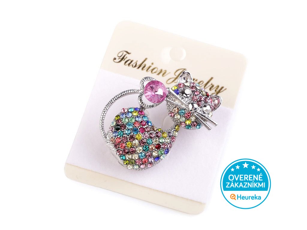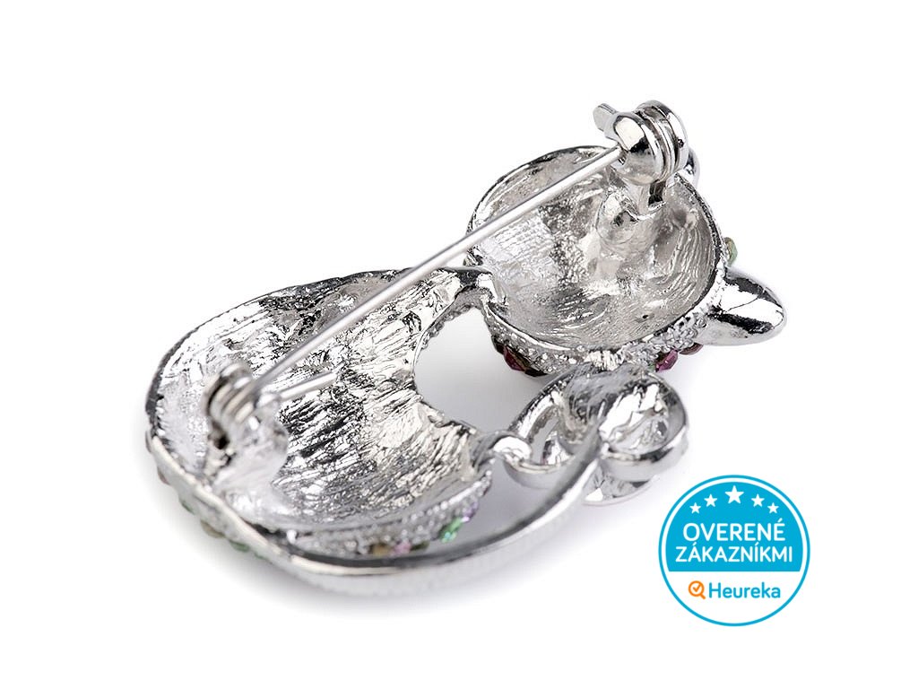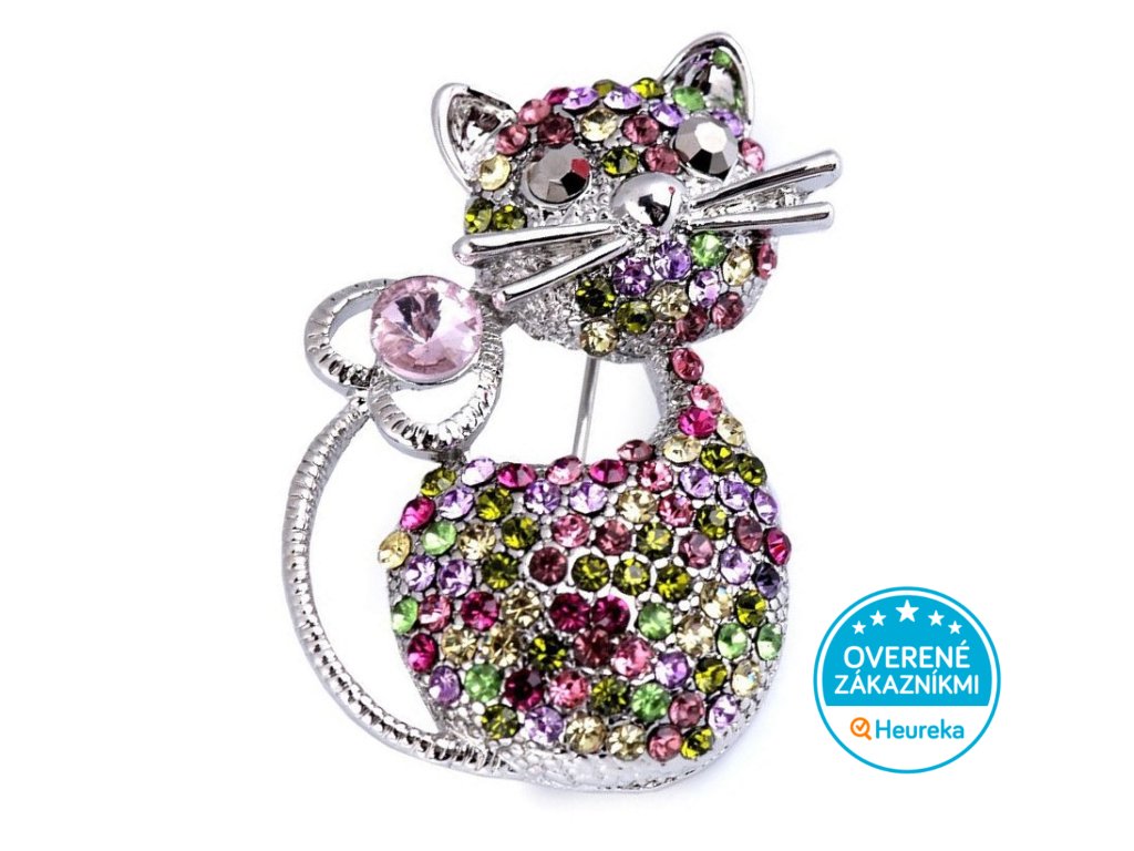 Trblietavá, precízne spracovaná brošňa v tvare mačičiek, vykladaná brúsenými Swarowski kryštálmi, v multicolor farbe. Perfektný tiež ako doplnok na batôžtek či tašku alebo na zopnutie šatky. Každá brošňa je originál a môže sa mierne farebne líšiť od fotografií.