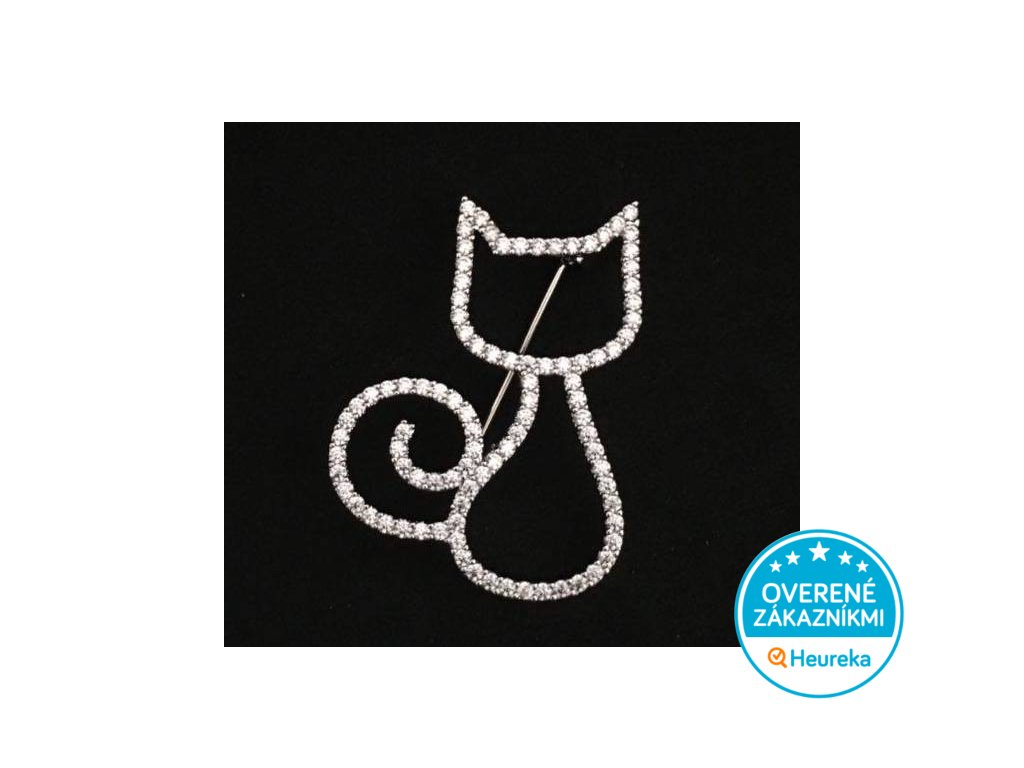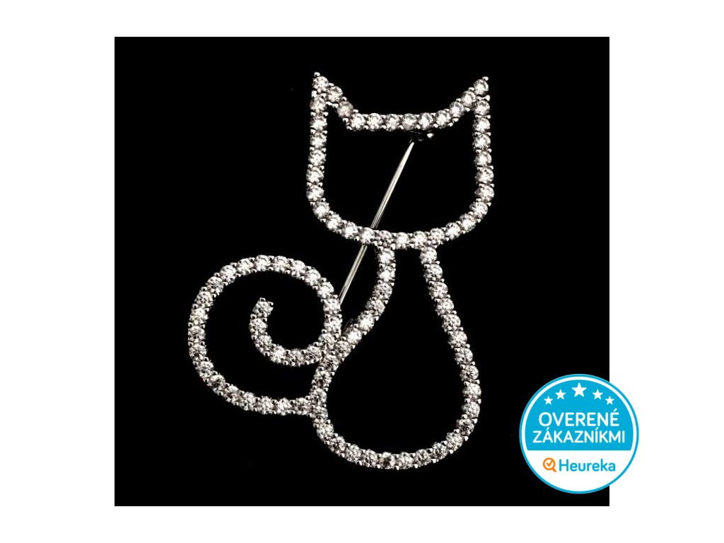 Luxusná, precízne spracovaná brošňa v tvare mačky, vykladaná trblietavými bielymi kryštáľmi. Perfektná pre slávnostné príležitosti, zvlášť dobre vynikne na tmavom oblečení.