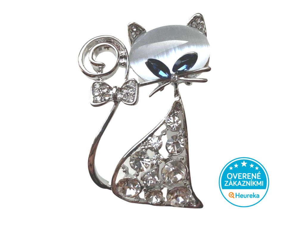Trblietavá, krásne spracovaná brošňa v tvare sediacej mačičky s opálovou hlavičkou, mašličkou z modrých kryštálov a s telíčkom vykladaným bielymi kryštálmi. Úžasne vynikne na tmavom oblečení.