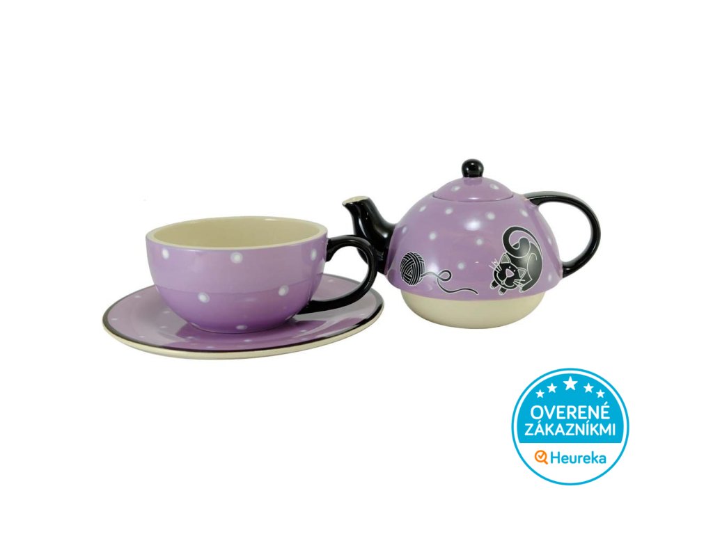 Trojdielna ručne maľovaná kameninová súprava s kanvičkou, šálkou a tanierikom s veselými čiernymi mačičkami. Krásny darček pre milovníkov mačiek. V priehľadnom darčekovom balení.