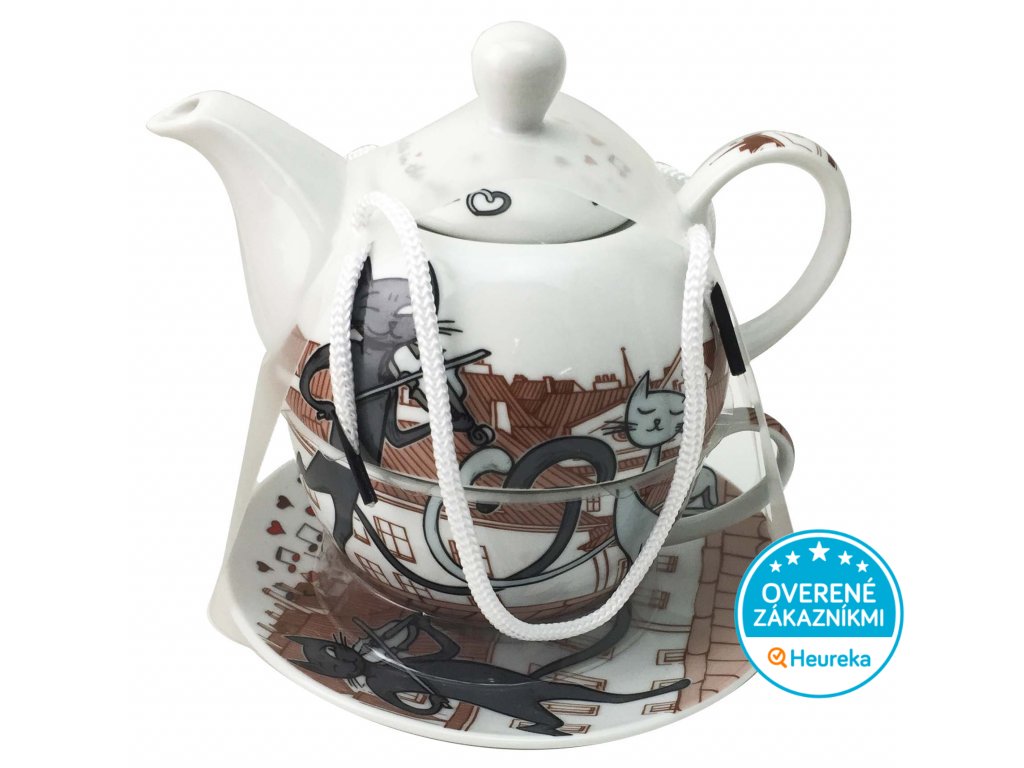 Porcelánová súprava s kanvičkou, šálkou a tanierikom s krásnym mačacím motívom. Ideálny darček pre milovníka mačiek. V priehľadnom darčekovom balení.