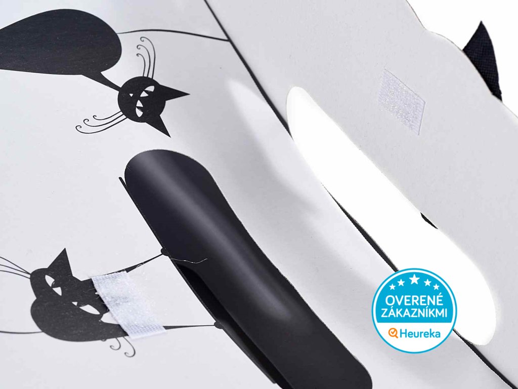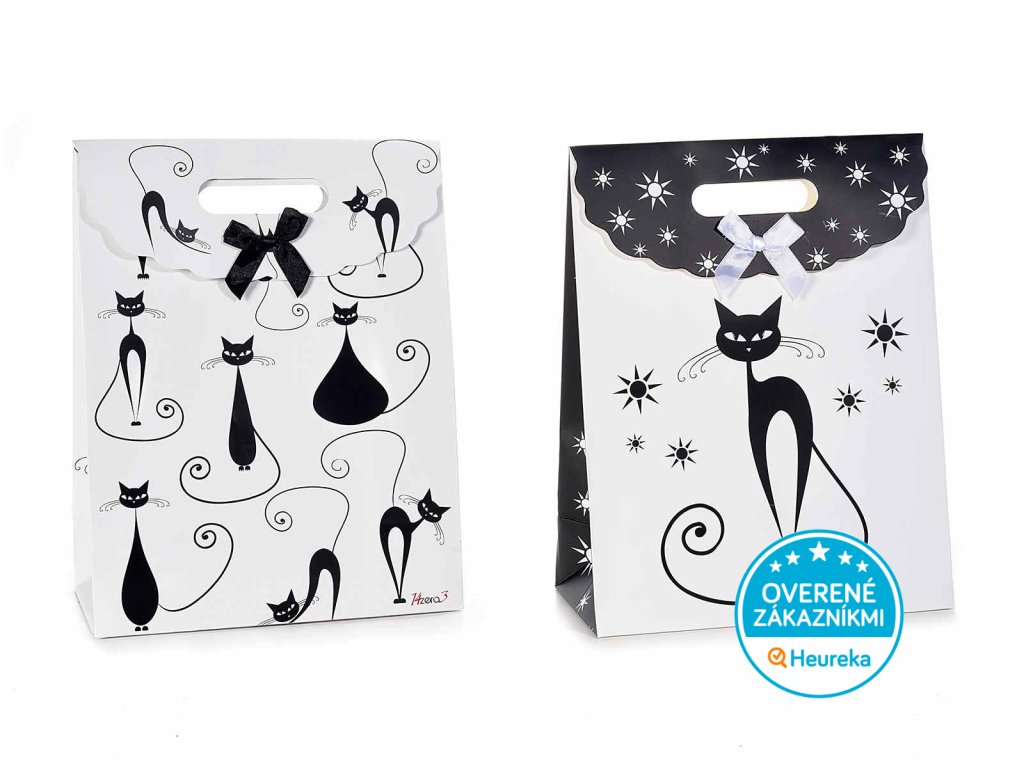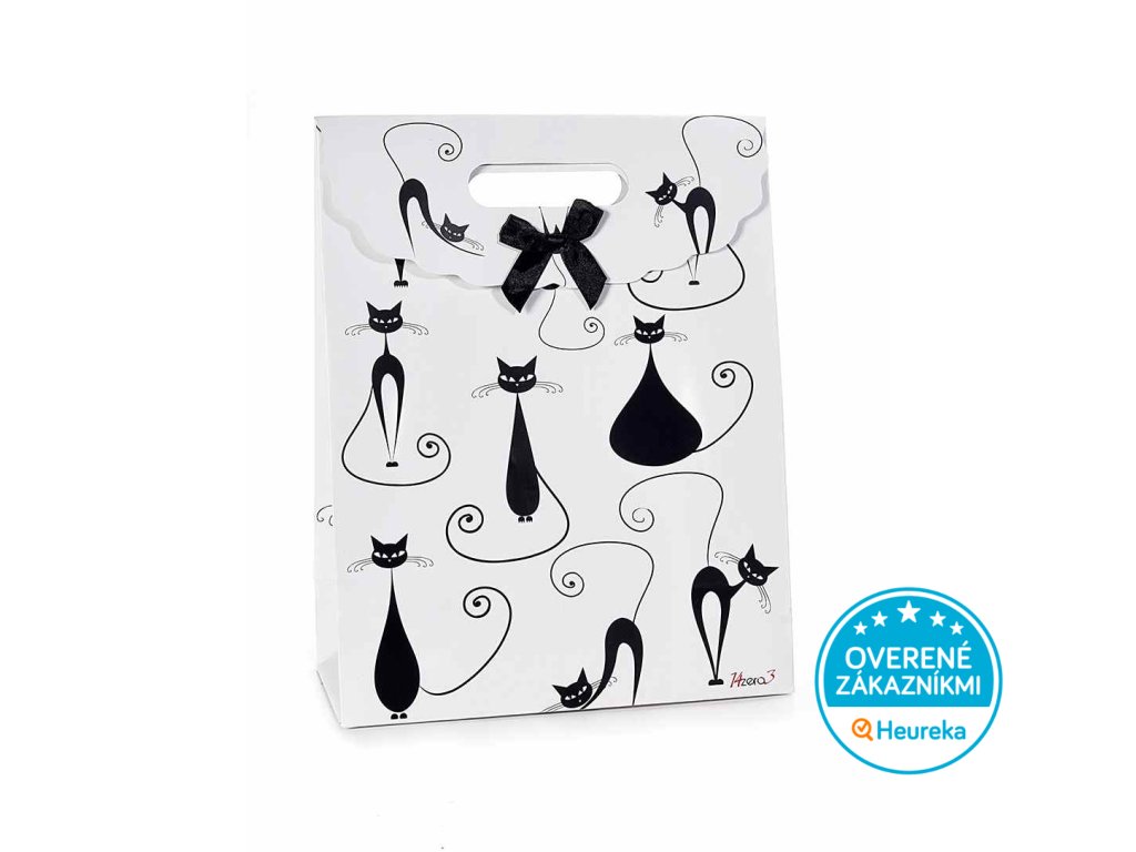 Väčšia mačacia darčeková taška s čiernymi mačičkami a zladenou mašľou sa hodí pre každú príležitosť. Darujte mačičárne pekne štýlovo! V bielej a čierno-bielej. Rozmer 24 x 12 x 31,5 cm.