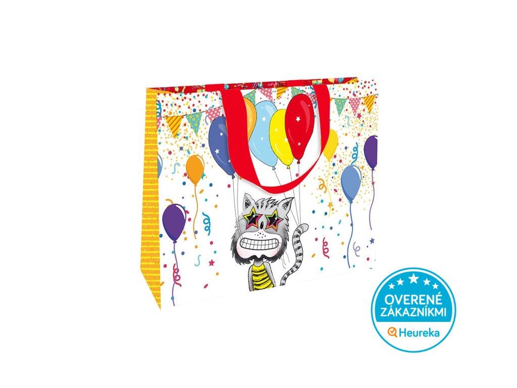 Väčšia darčeková taška s kocúrom a balónikmi pritiahne pozornosť! Perfektné na akýkoľvek mačací darček a oslavu. So saténovými uchami.