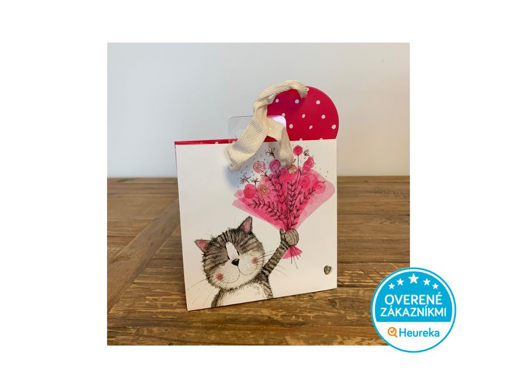 Krásna darčeková taška s mačkou a kyticou ruží v dizajne maliarky Alex Clark . S menovkou na uchu.