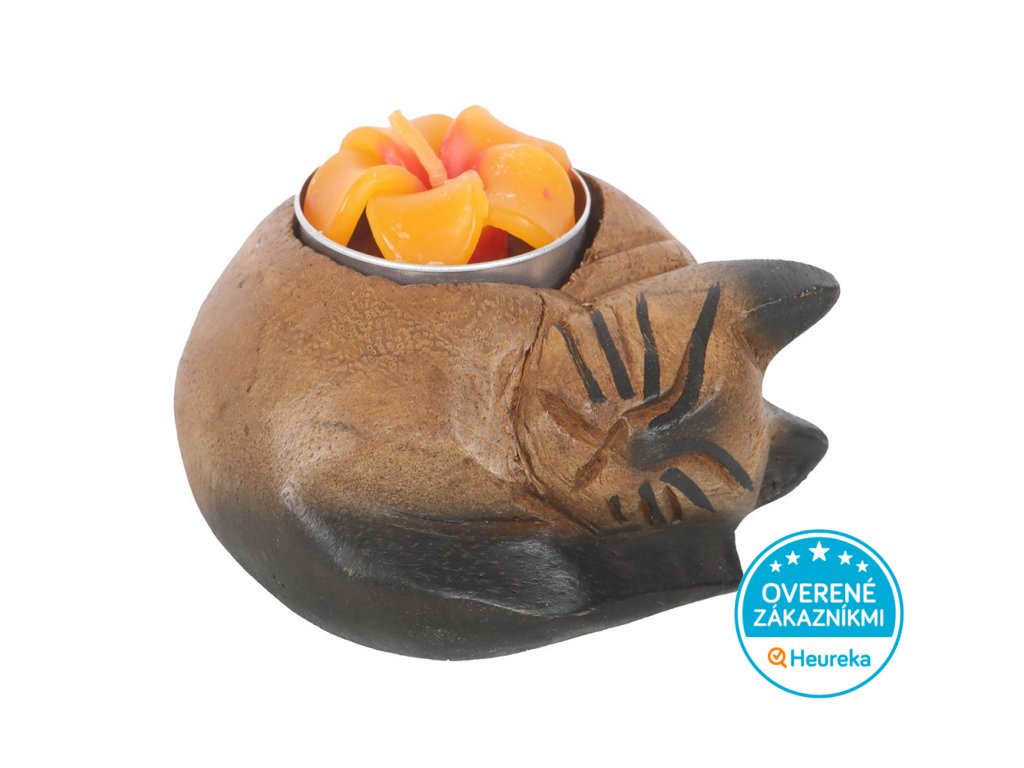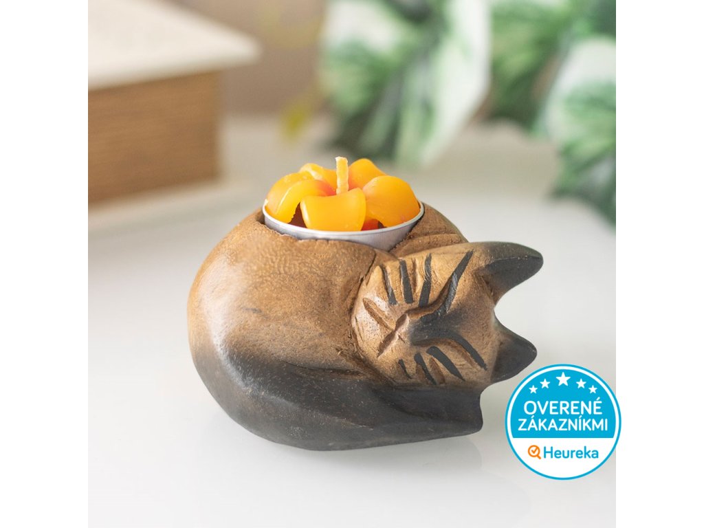 Krásny drevený svietnik v tvare spiacej stulené mačičky sa hodí do každého interiéru. Pre perfektnú mačaciu atmosféru. Na čajovú sviečku.
