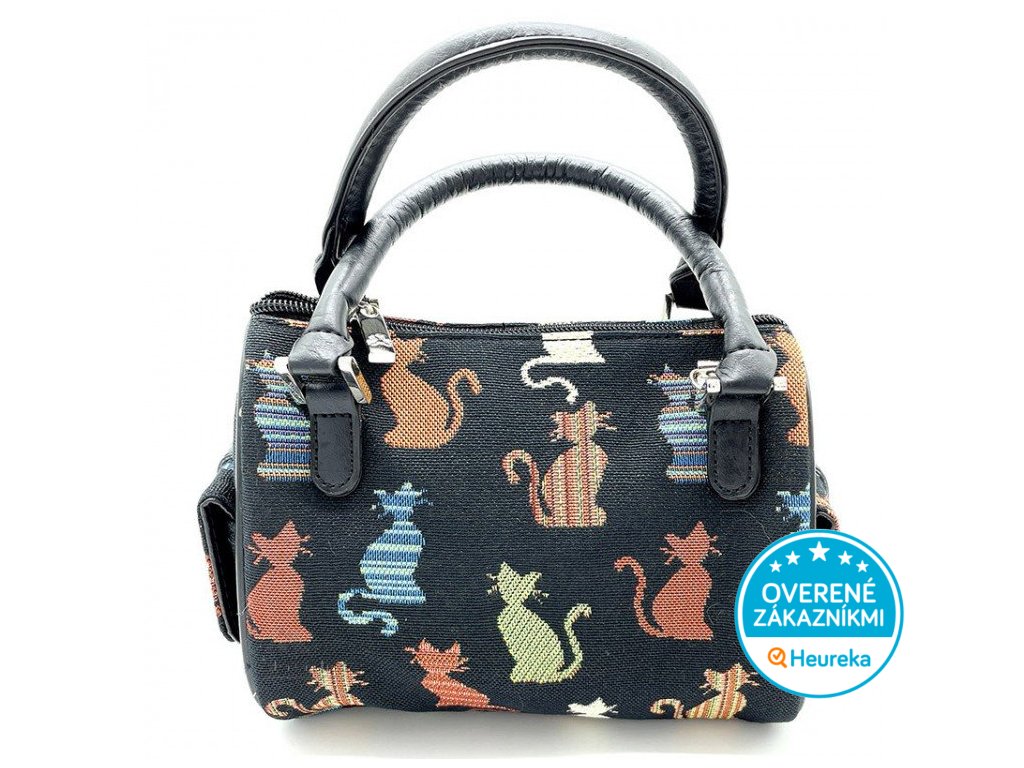 Krásna štýlová gobelínová kabelka s vyšívanými realistickými mačičkami, s dvoma postrannými kapsičkami, na dlhom popruhu. Parádne do spoločnosti alebo na rande.