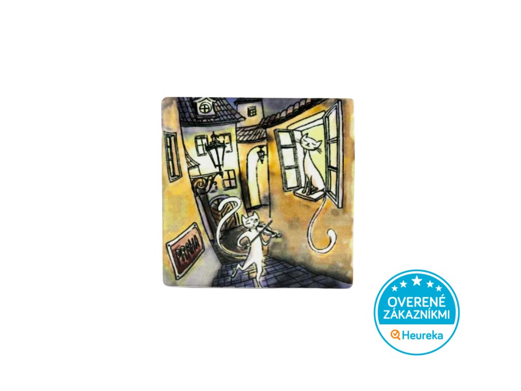 Štýlová keramická magnetka so zamilovaným mačacím párom v kulisách starej Prahy. Krásna na chladničke aj na nástenku.