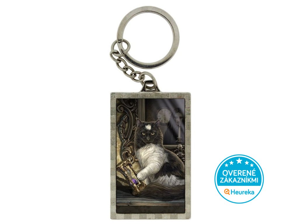 Kovová kľúčenka s magickou mačkou a presýpacími hodinami s menivým efektom v dizajne Lisa Parker. Vaše kľúče ešte nikdy nemali tak čarovné stráženie! Mačička je z oboch strán.