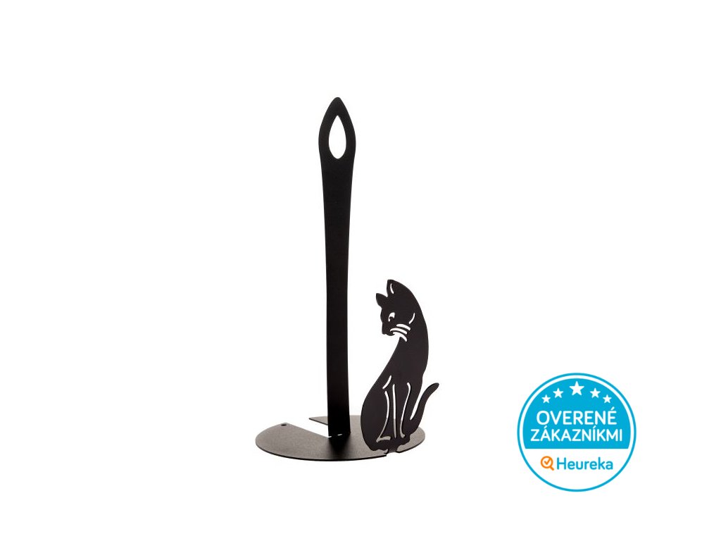 Štýlový kovový stojan na rolke kuchynských papierových utierok so sediacou mačičkou.