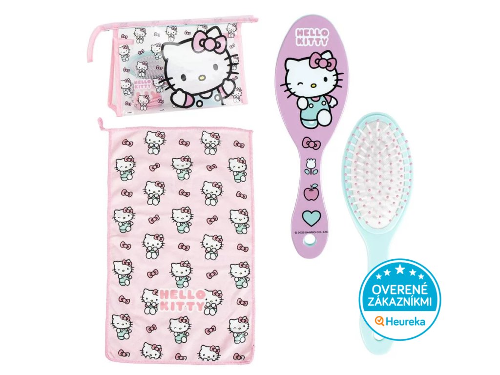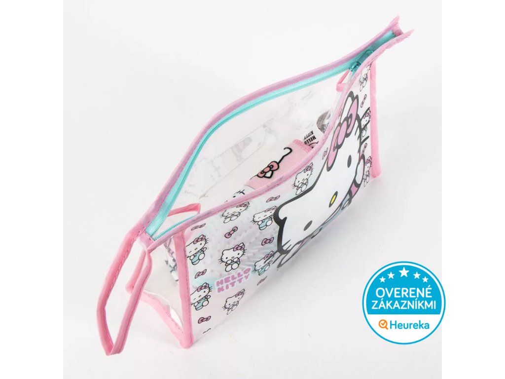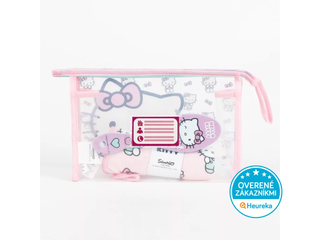 Super vychytávka do každej kabelky aj na cesty - priehľadná kozmetická taška s uterákom a kefou na vlasy s mačičkou Hello Kitty. Úžasný darček pre veľké aj malé mačacie dámy.