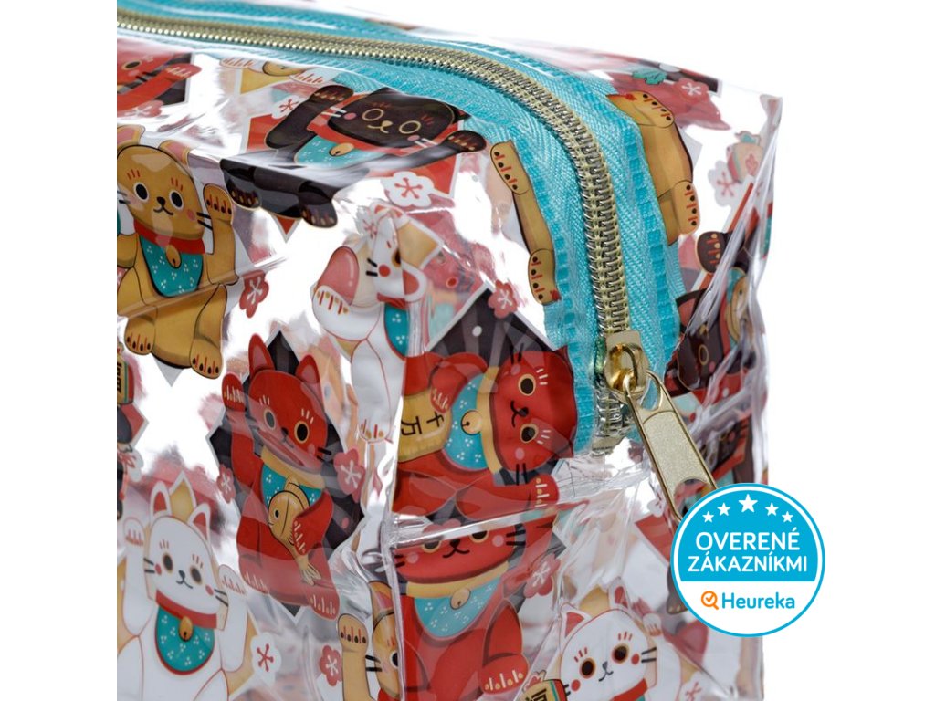 Priestranná kozmetická taška s obľúbenou mačičkou pre šťastie Maneki Neko - Lucky Cat, v pestrom farebnom prevedení, na zips. Perfektná na kozmetiku, makeup, do kabelky aj na dlhšie cesty.