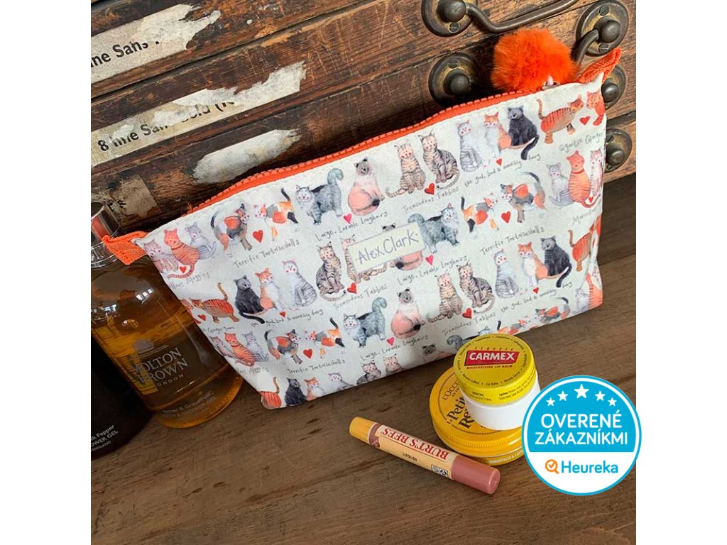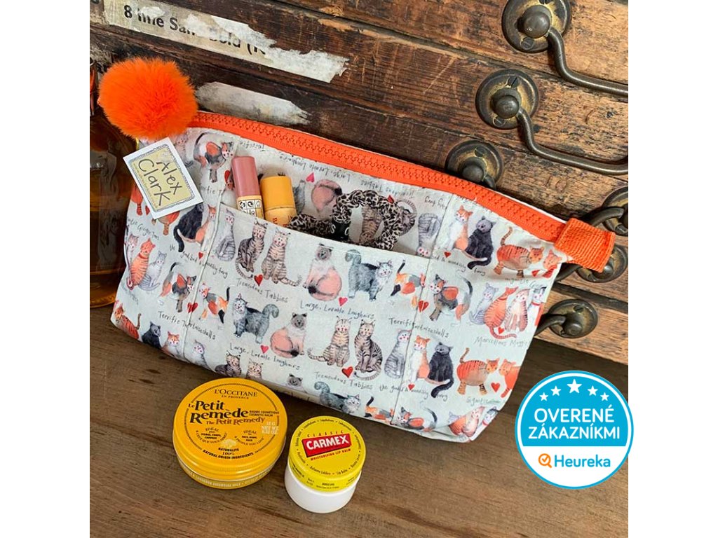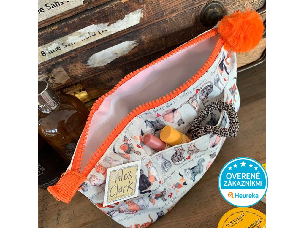 Krásna dizajnová kozmetická taška s maľovanými mačičkami od vychytavky-od-autorky Alex Clark, s kontrastným oranžovým zipsom a chlpatým pompom. Perfektná na cesty, alebo napríklad do fitka. Neobsahuje kozmetické produkty.