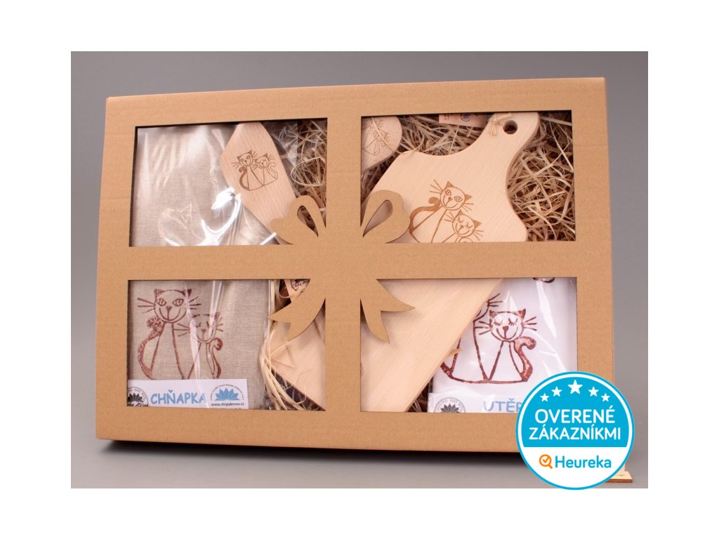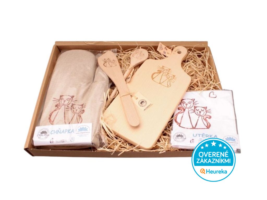 Krásna darčeková sada do kuchyne s mačacím motívom obsahuje doštičku, varešku, obracačku, utierku, chňapku v darčekovej krabici. Drevené náčinie je z bukového dreva. látkové z čistej bavlny. Parádny darček a ozdoba každej mačacej kuchyne . Z vychytavky-do-autarskej dielne zo severu Moravy.