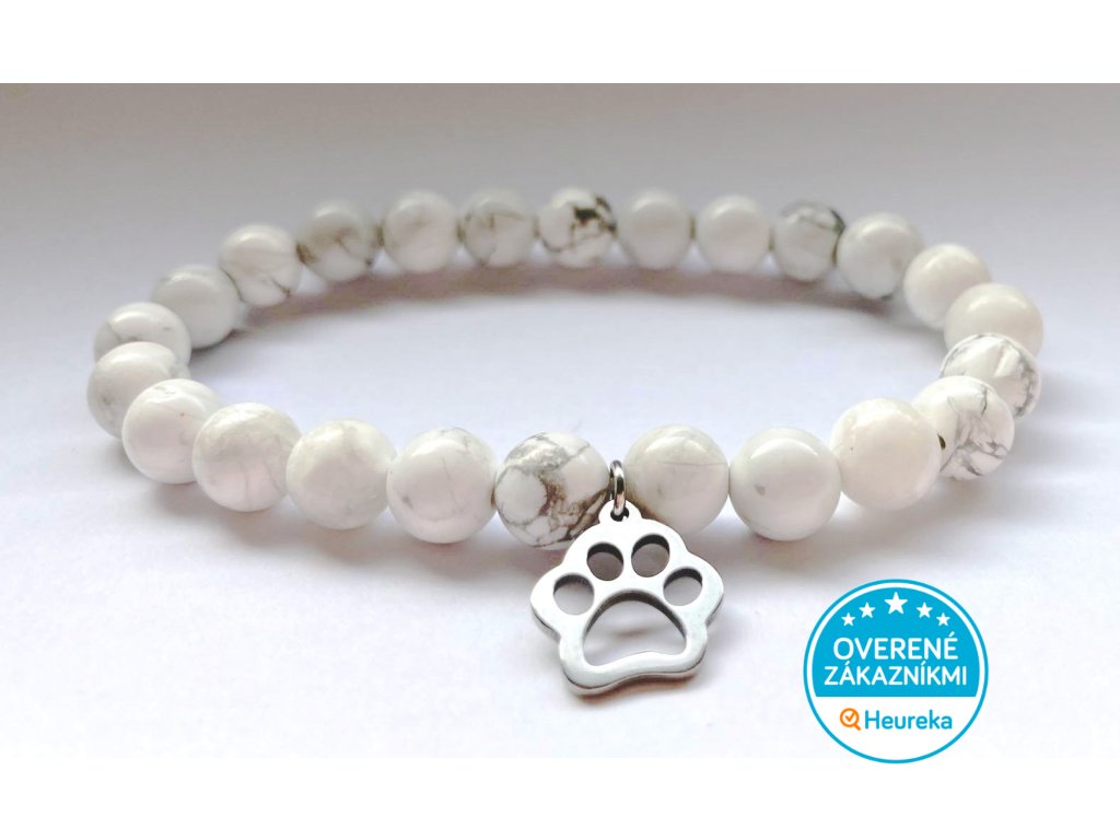 Minerálny náramok z howlitu alebo magnezitu s príveskom v tvare mačacej labky z chirurgickej ocele. Z telčskej šperkárskej dielne Krásna pani. Howlit znižuje stres, uľavuje od vnútornej bolesti a potláča pocity hnevu. Pomáha lepšie pochopiť vlastné myšlienky a odstrániť negatívne emócie. Dodáva silu emocionálne dozrieť a budovať charakter. Howlit taktiež podporuje kreativitu a zlepšuje pamäť.