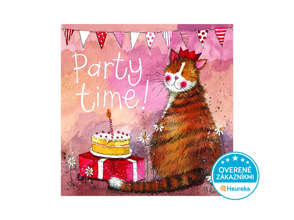 Veselé dizajnové narodeninové blahoželanie s mačičkou, darčekom, tortou a nápisom PARTY TIME. Perfektné pre všetkých milovníkov mačiek. Autorský obrázok je od Alex Clark. S obálkou.