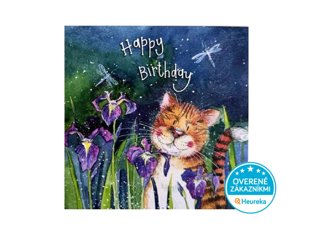 Dizajnové narodeninové blahoželanie s mačičkou v kosatcoch. Krásna mačičiareň pre všetkých milovníkov mačiek. Autorský obrázok je od maliarky Alex Clark. S obálkou.