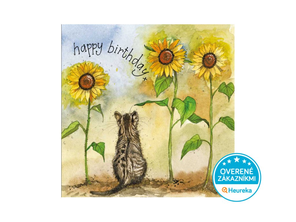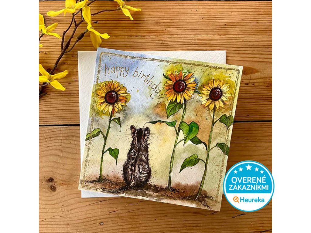 Dizajnové narodeninové blahoželanie s mačičkou a slnečnicami , pre milovníkov mačiek ako stvorené. Autorský obrázok je od Alex Clark .