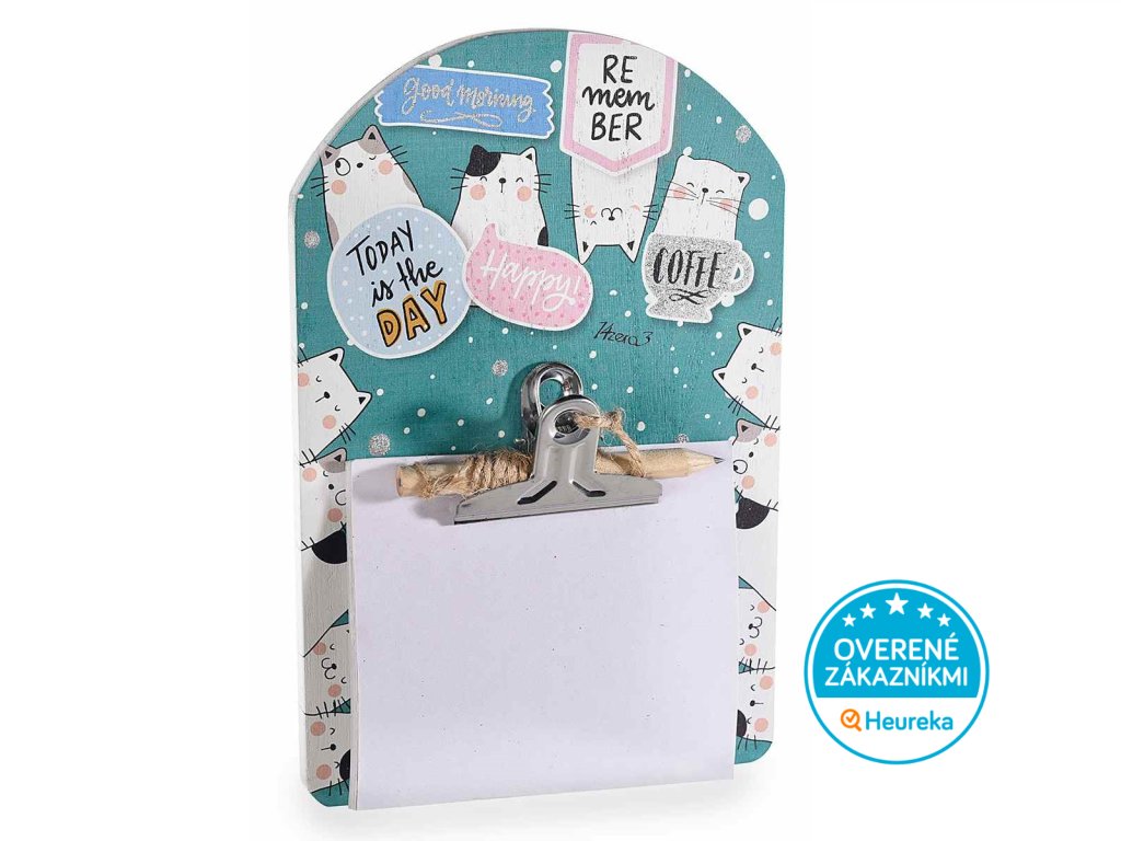 Štýlový mačací nástenný držiak na poznámkový bloček. Perfektný na nákupné zoznamy, pripomienky a úlohy. Rozmer 12,5 x 19,5 cm.