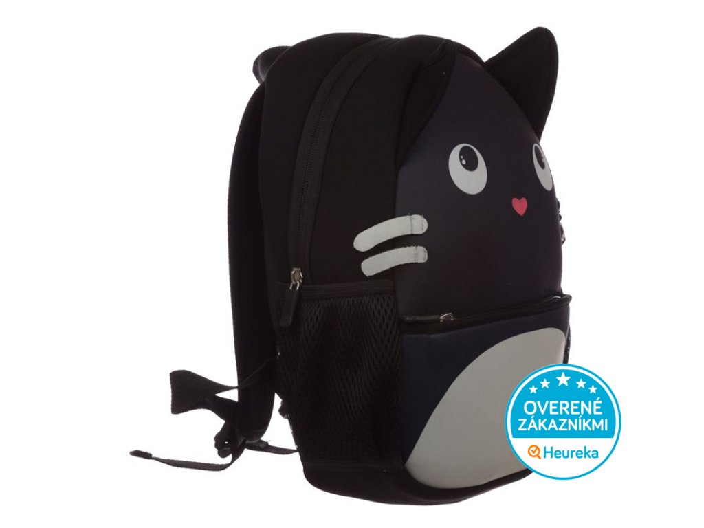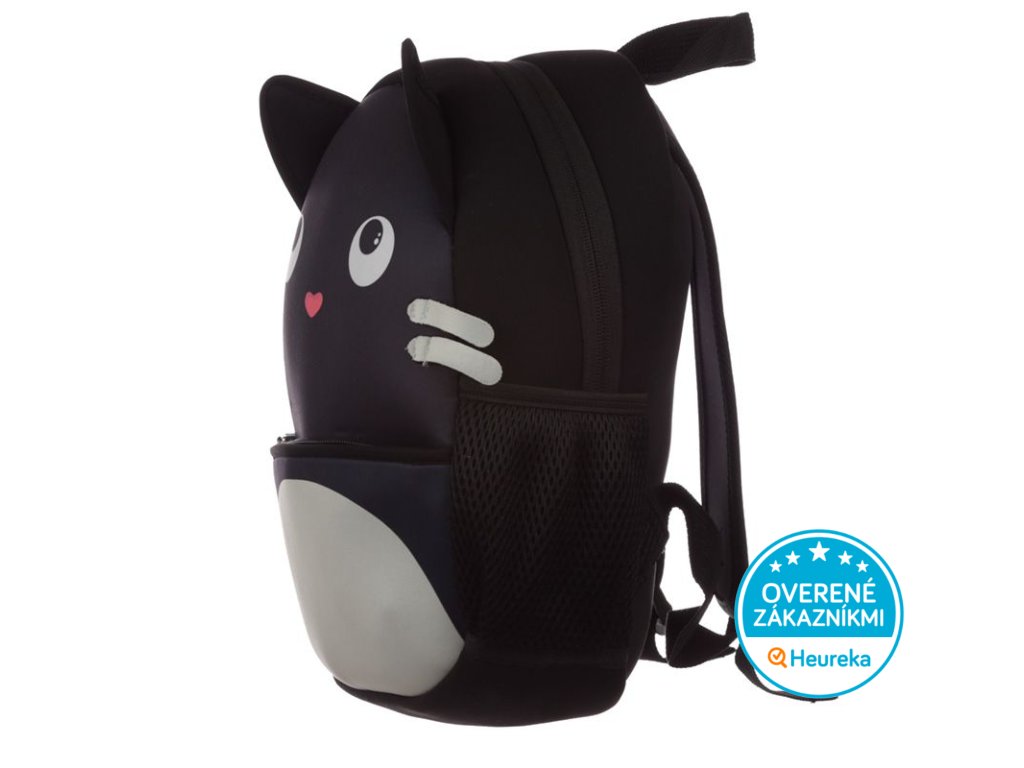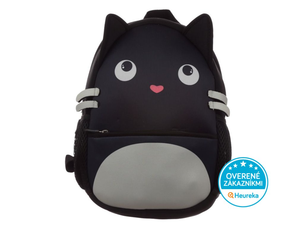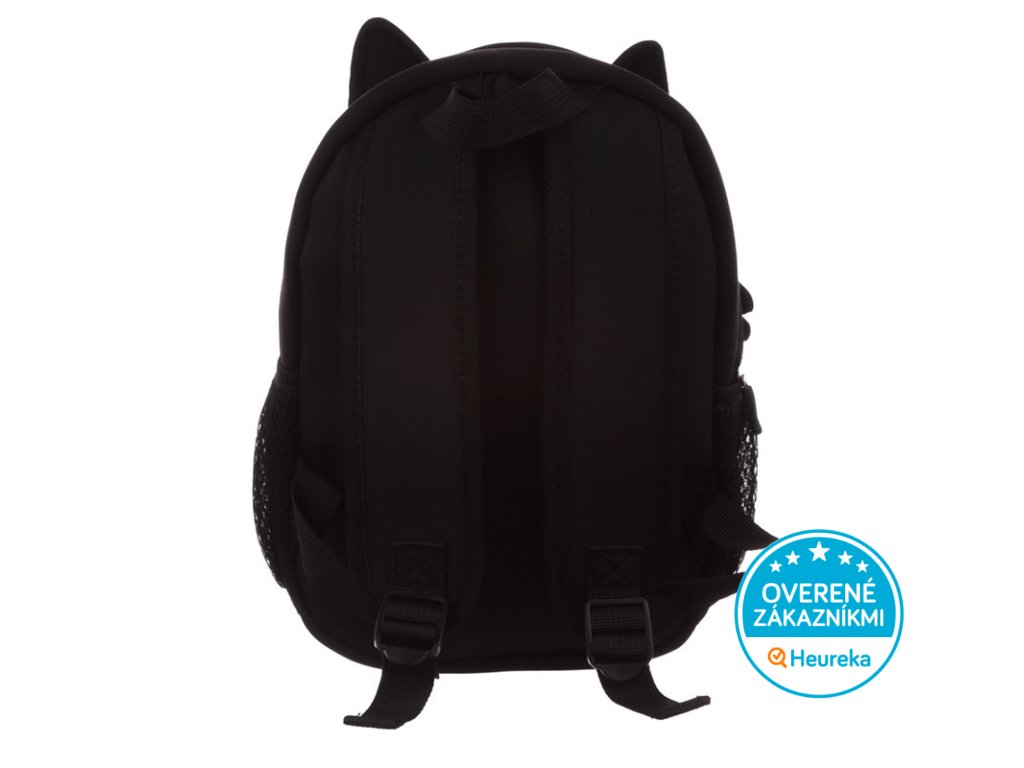 Neoprénový batôžtek v tvare čiernej mačičky s fúzikmi a uškami. Hlavné vrecko je na zips, predné vrecko tiež a po stranách sú dve sieťované vrecká. Perfektné do školy aj do mesta.
