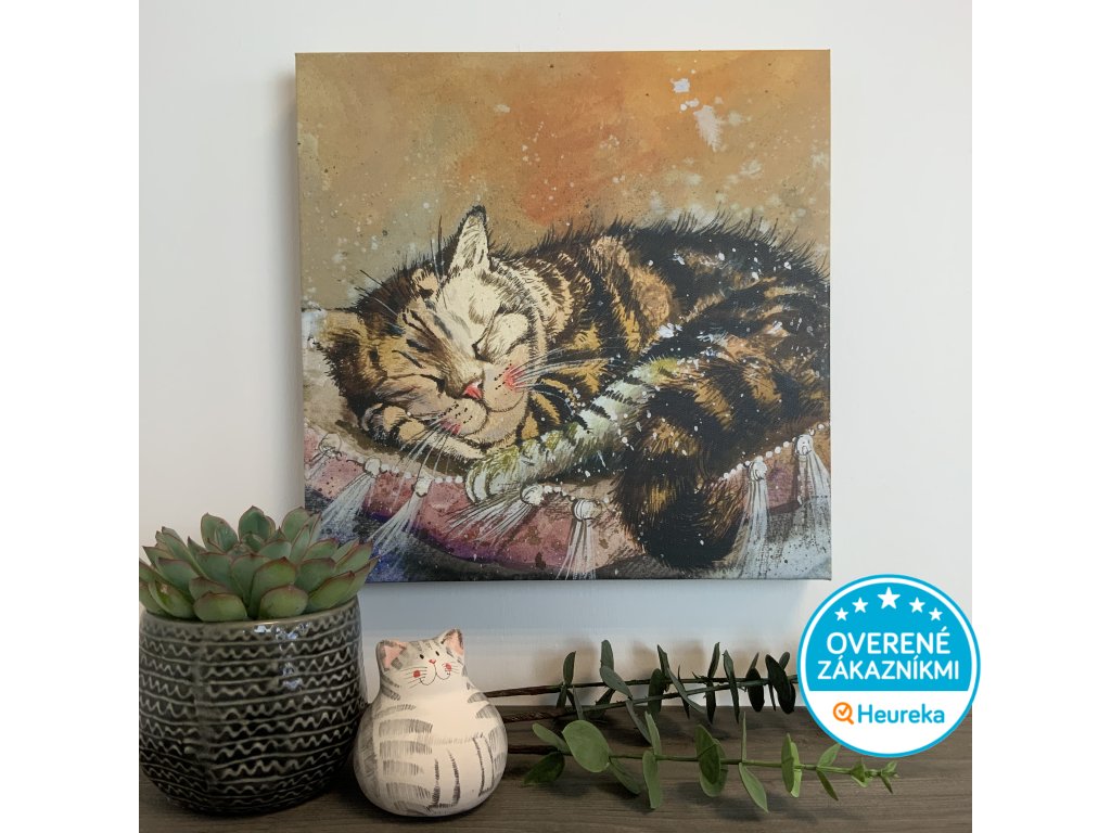 Väčší dizajnový obraz (plátno natiahnuté na ráme, 30 x 30 x 3 cm) so spiacim mačiatkom . Autorkou motívu je maliarka Alex Clark.