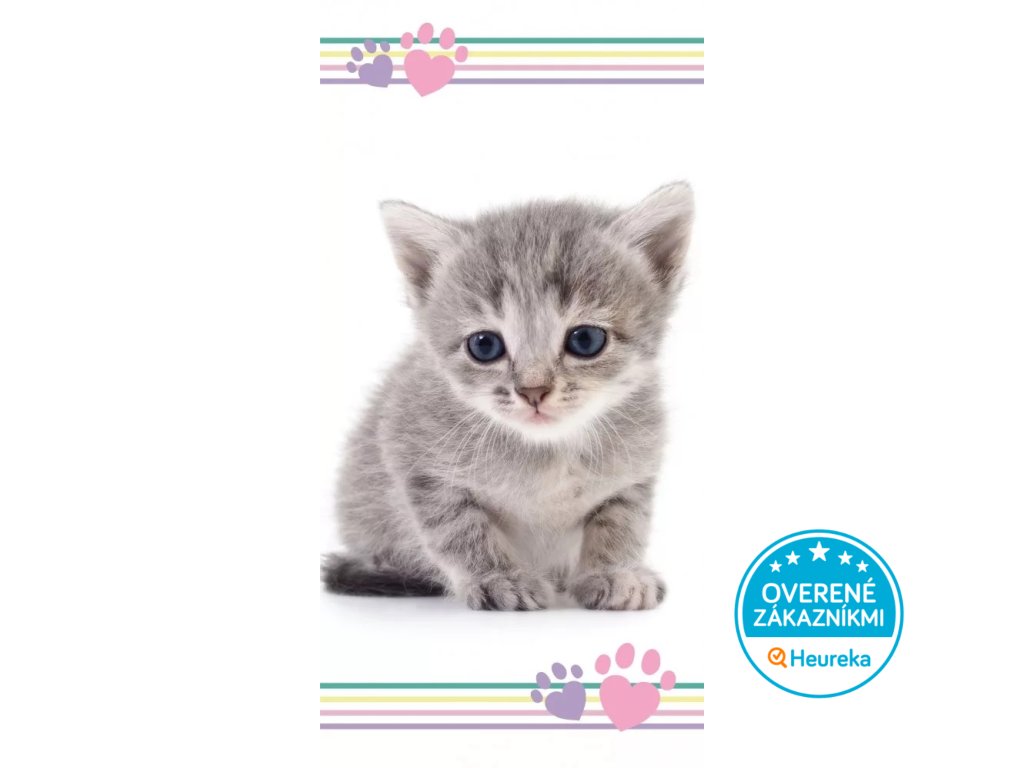 Veľká osuška zo savej bavlny s roztomilým mačiatkom a pastelovými labkami v tvare srdiečok. Hravý dizajn si zamiluje každá milovníčka mačičiek. Rozmer 170x40 cm.