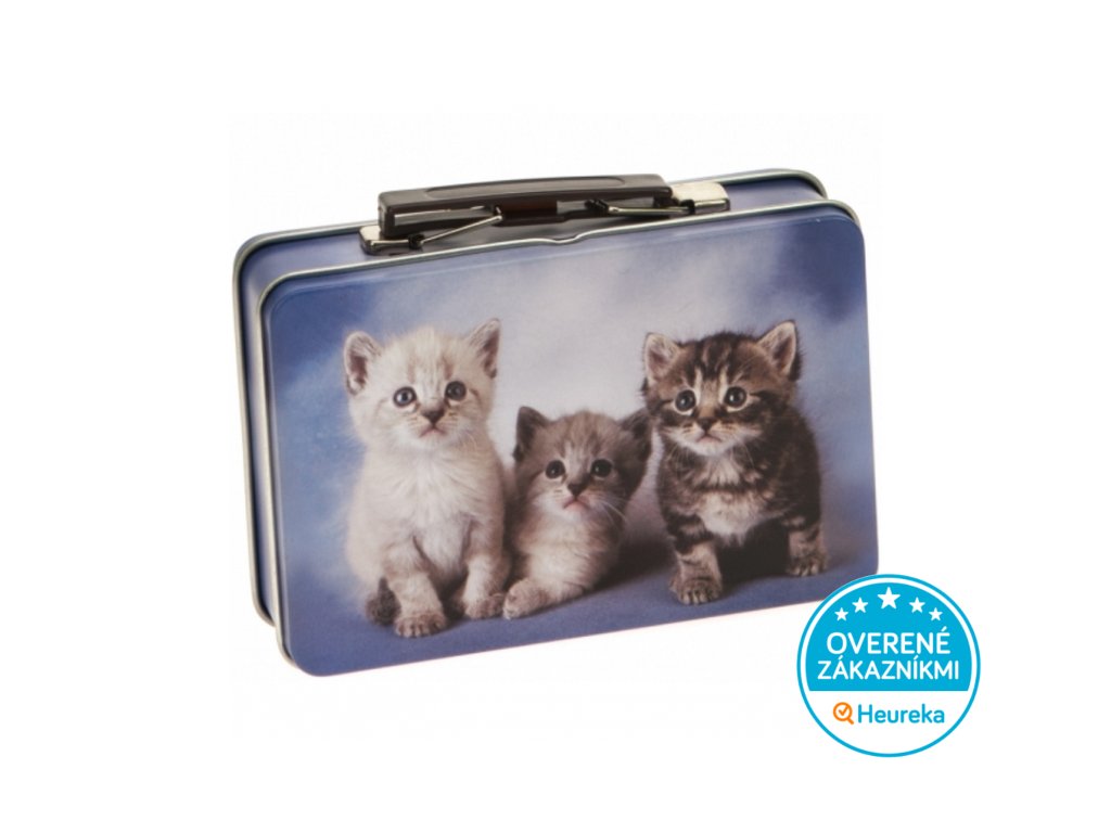 Plechová krabička v tvare kufríka so zapínaním a madlom, s motívom roztomilých mačiatok. Super na šperky , lieky alebo napríklad ako KPZ. Rozmer 12 x 8 x 3,5 cm.