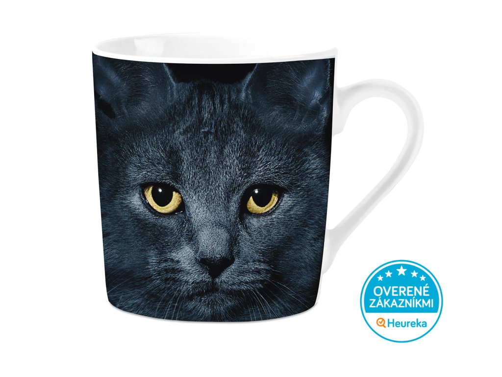 Stredne veľký porcelánový hrnček s čiernou mačičkou s žltými očami, v darčekovej krabičke. S objemom 240 ml je ideálny na kakao alebo kávu s mliekom.