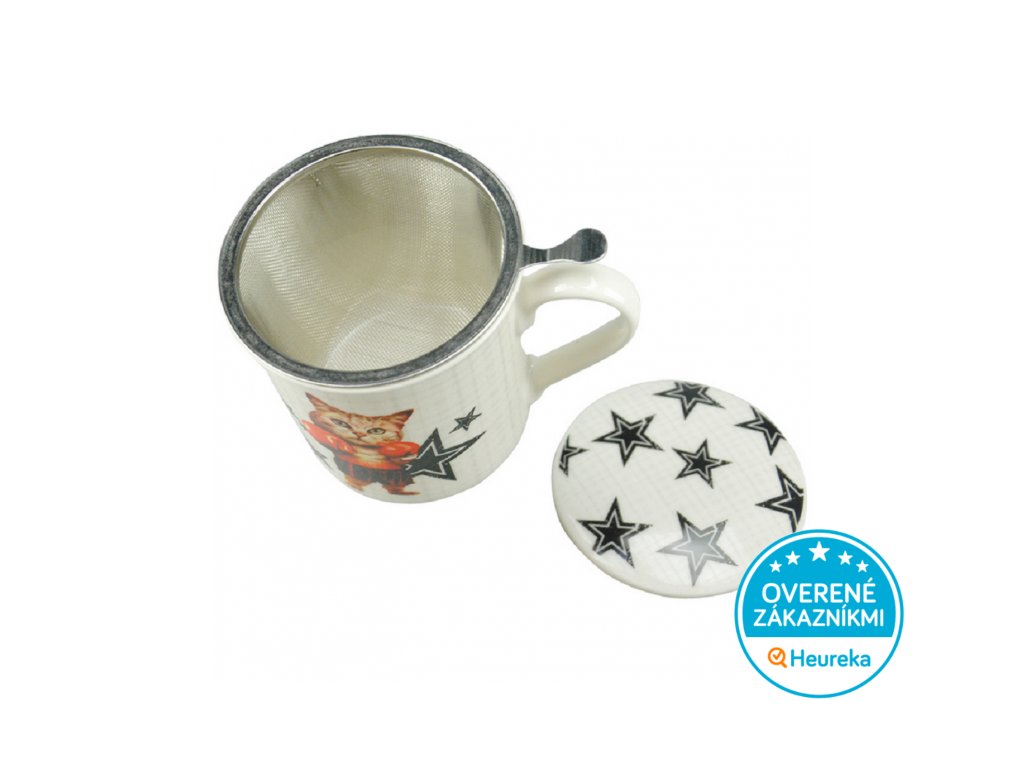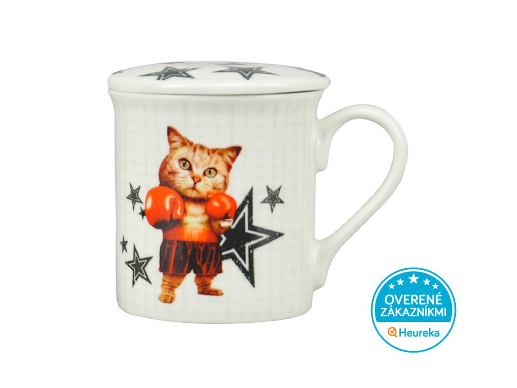 Porcelánový hrnček so sitkom a pokrievkou s maľovanou boxujúcou mačičkou . Ideálne na čaj alebo kávu. Zahreje v brušku aj na duši! V krabičke.