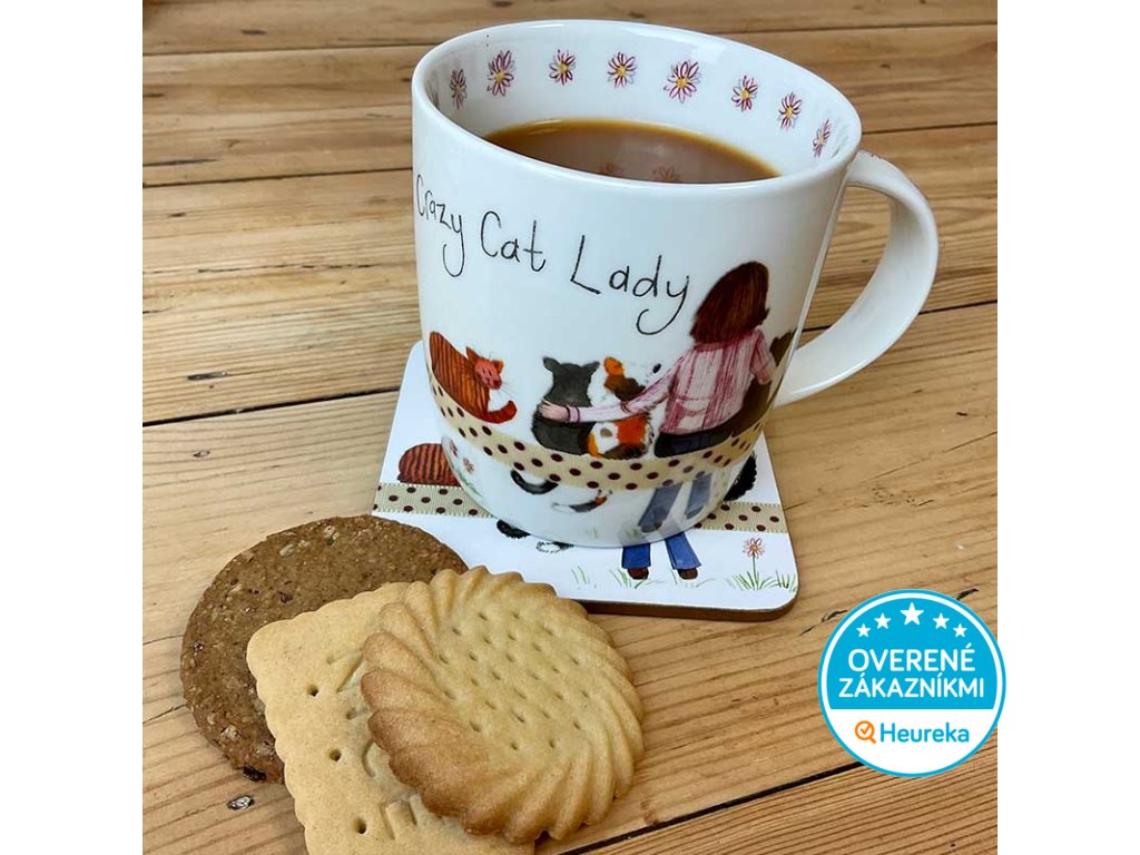 Veľký hrnček s kreslenými mačkami, mačacou dámou a nápisom "Crazy Cat Lady", s motívom margaréty na ušku, od autorky Alex Clark. Ideálne na čaj alebo veľkú kávu. Zahreje v brušku aj na duši!