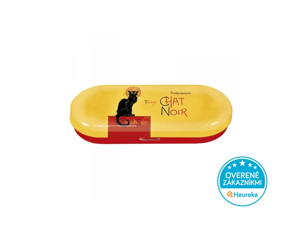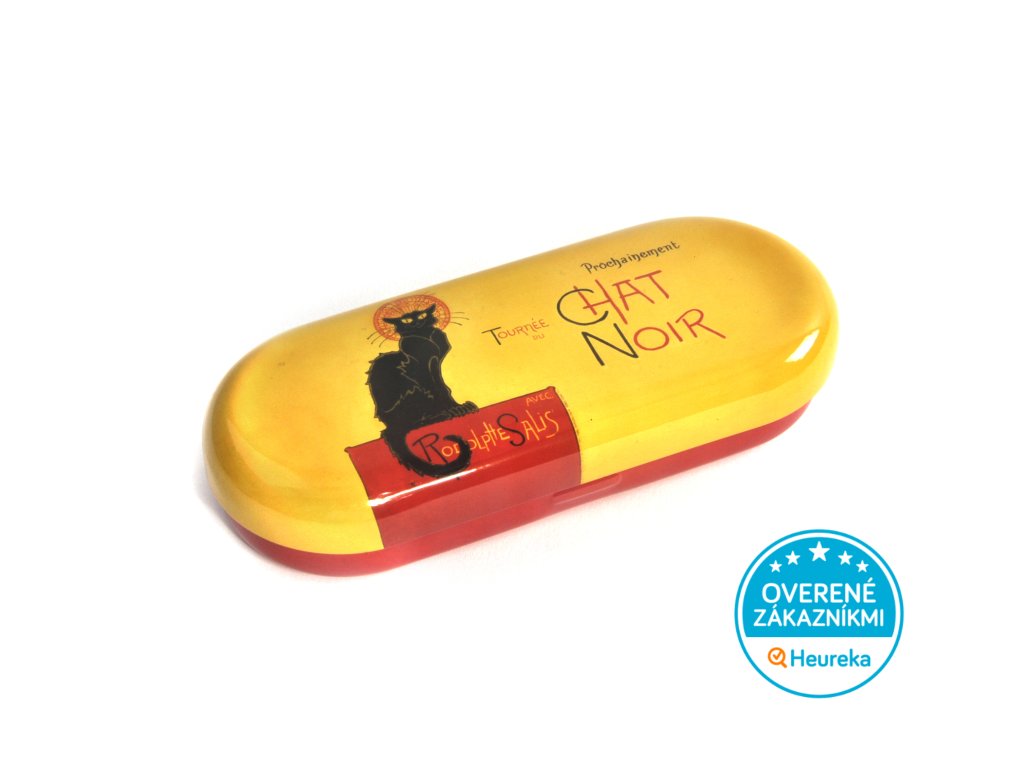 Pevné designové pevné puzdro na okuliare s jelenicovým vnútrom so symbolom parížskej bohémy - čiernym kocúrom Le Chat noir. Štýlový mačací doplnok, krásny ako darček.
