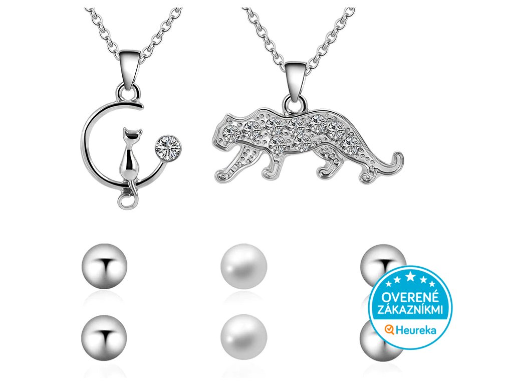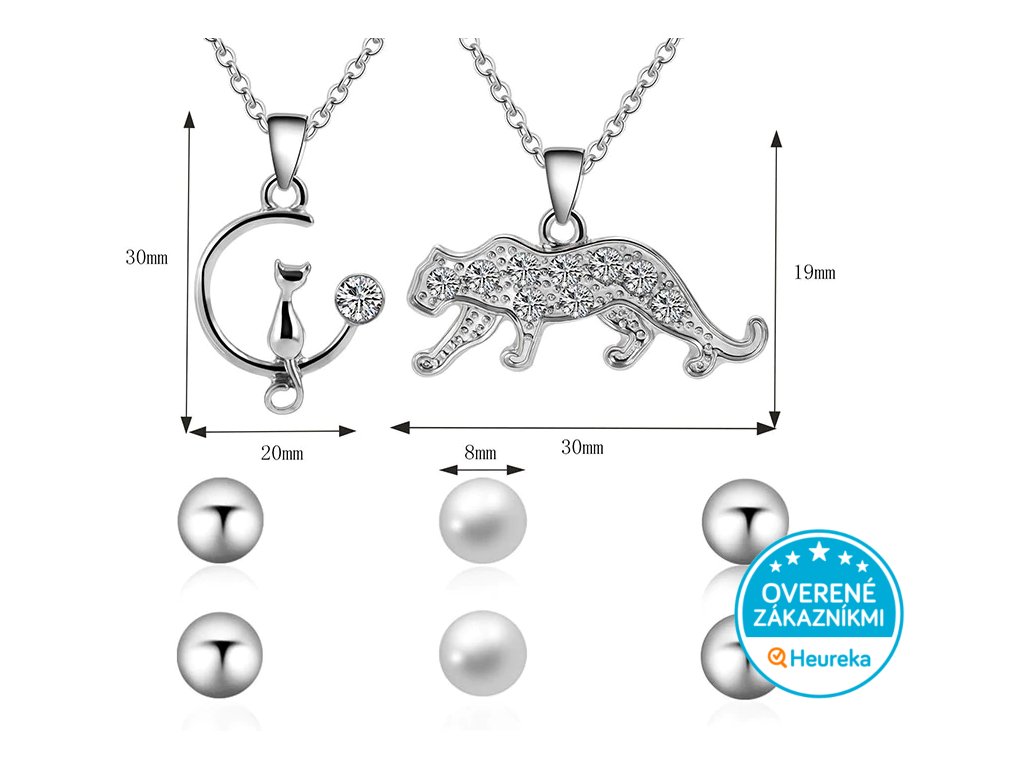 Sada s dvoma náhrdelníkmi s motívmi mačiek s trblietavými kryštálmi a s tromi pármi zladených perličkových náušnic. Krásny darček pre mačaciu dámu.