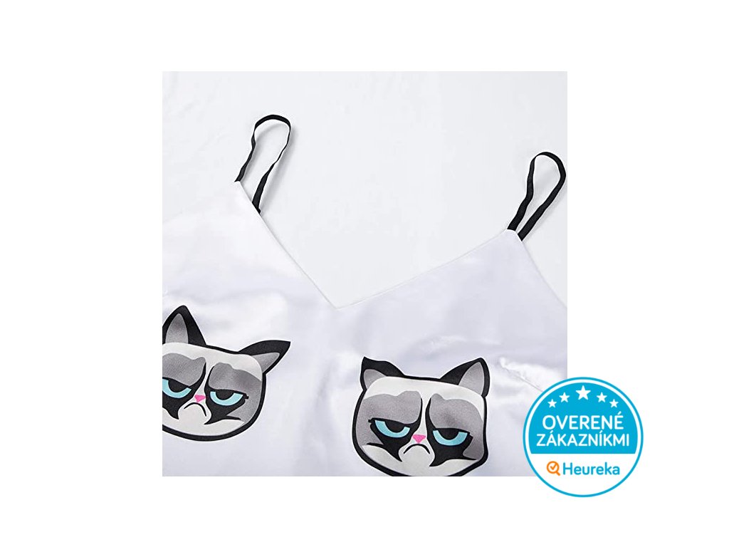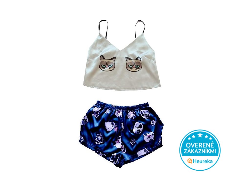 Letný saténový pyžamový set (biele tielko a tmavomodré až čierne šortky) s obľúbenou mrzutou mačičkou Grumpy Cat. Parádna mačičáreň pre každú kočku! Veľkosť S / M (prsia 80-88 cm, pas 62-80 cm, boky 90-105 cm) alebo L / XL (prsia 85-100 cm, pas 70-85 cm, boky 90-120 cm).