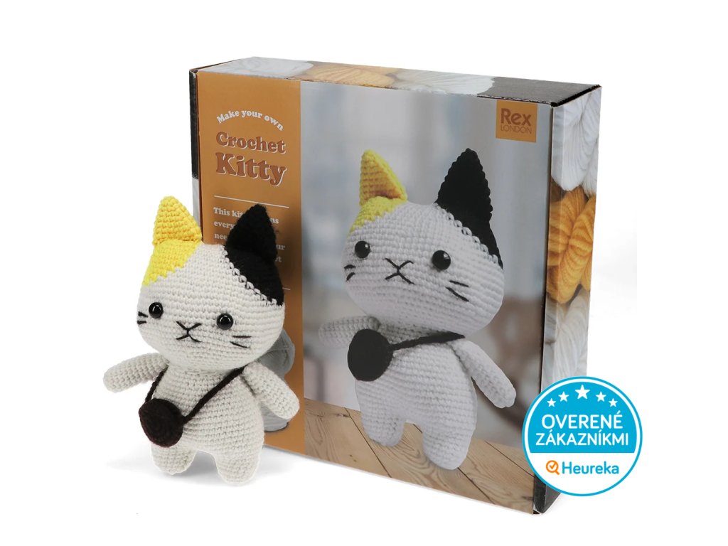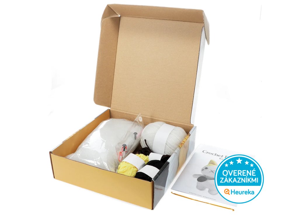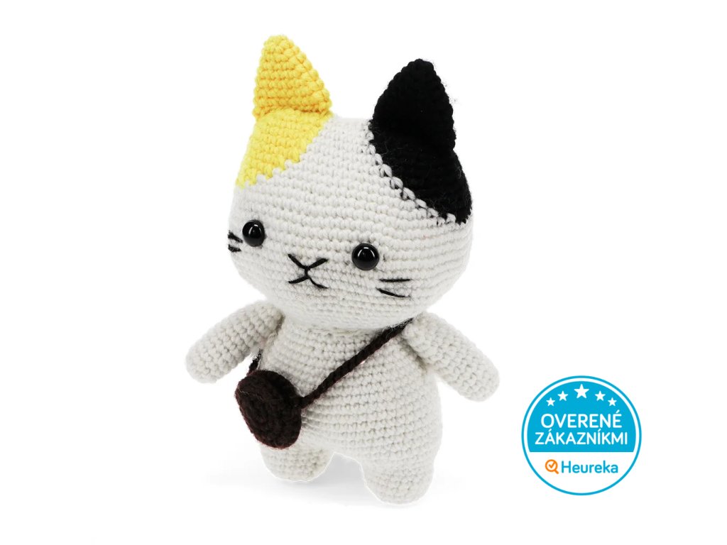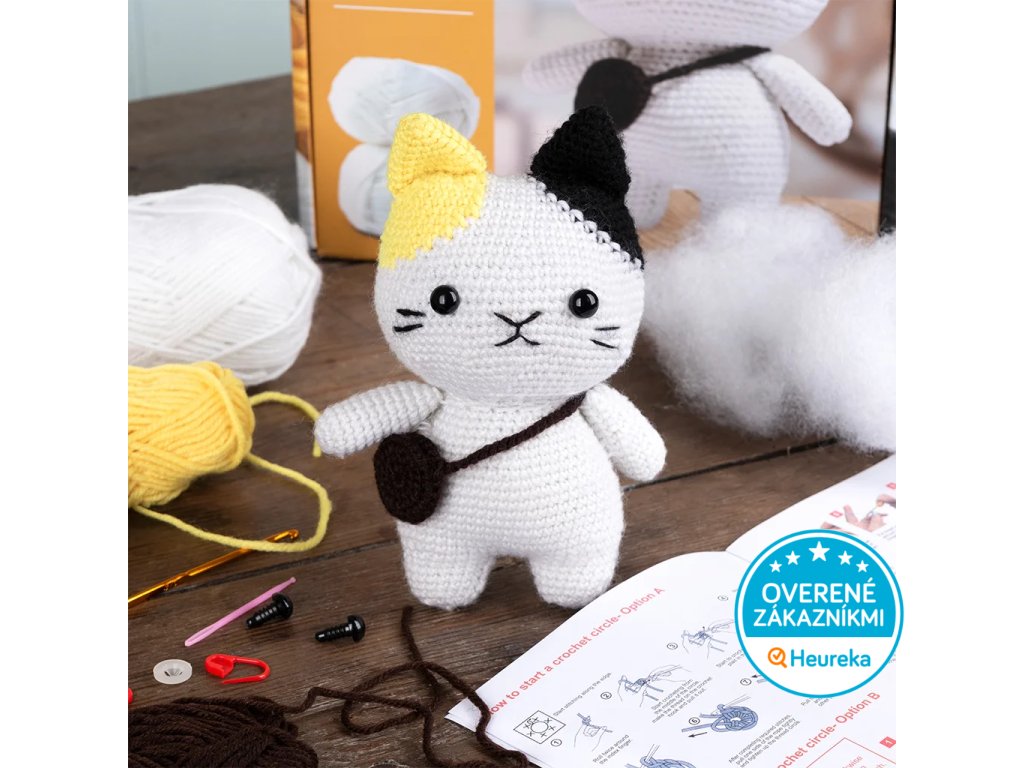 Originálna sada na DIY tvorbu háčkovanej mačičky je ideálny pre tých, ktorí už majú nejaké skúsenosti s háčkovaním . Hotová mačička meria približne 17 cm.