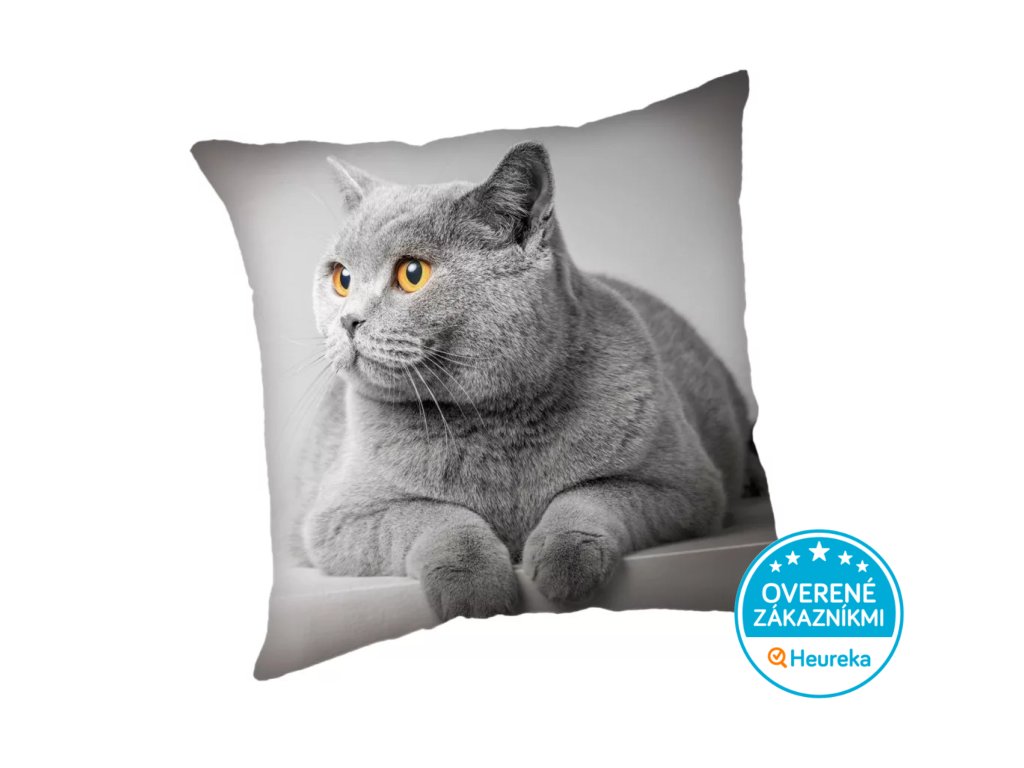 Dekoratívny povlak so šedivým britským kocúrom so žltými očami, perfektný do obývačky aj spálne. Štýlový doplnok do každej mačacej domácnosti. Rozmer 45 x 45 cm.