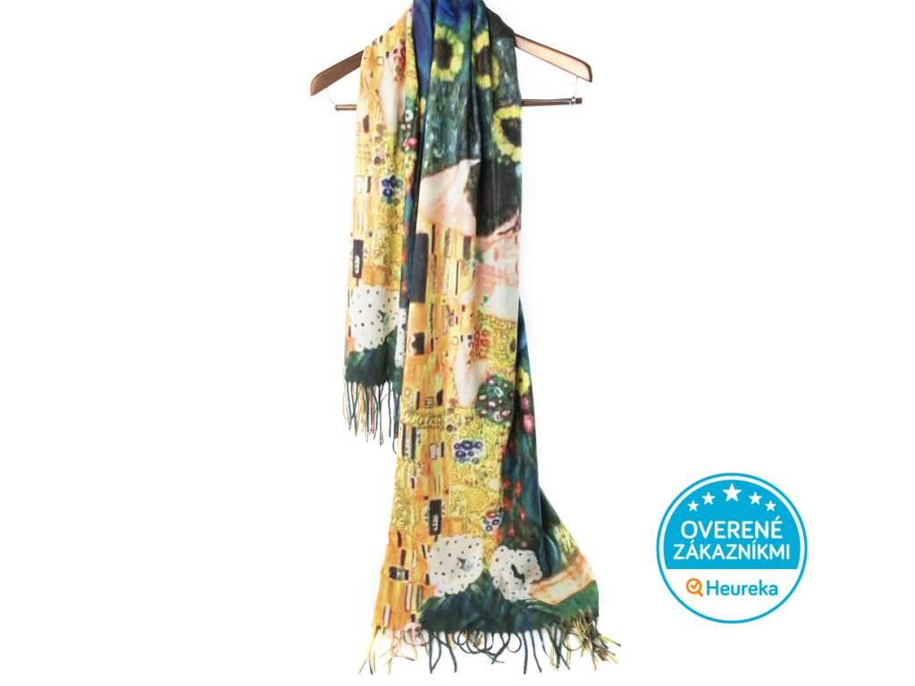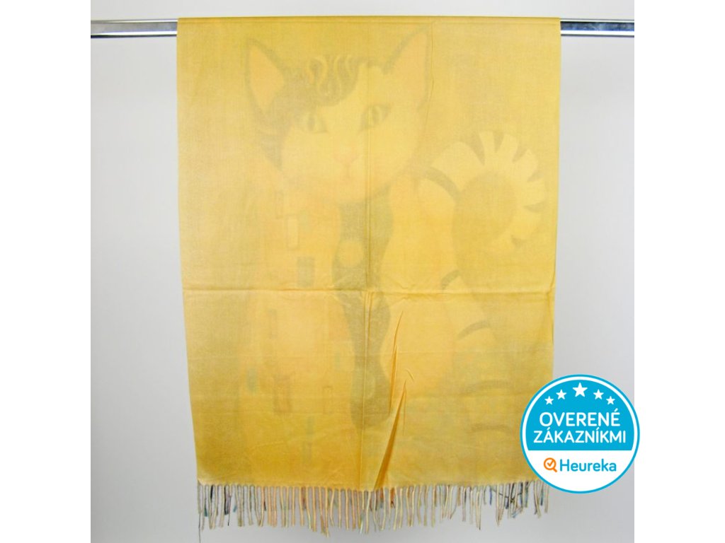 Dlhý hebký šál (0,7 x 2 m) s nádhernou mačičkou v štýle maliara Gustava Klimta, s obojstrannou potlačou. Dokonale elegantný a štýlový doplnok pre každú mačaciu dámu zo zmesi vlny a viskózy rozžiari každý outfit a zahreje.