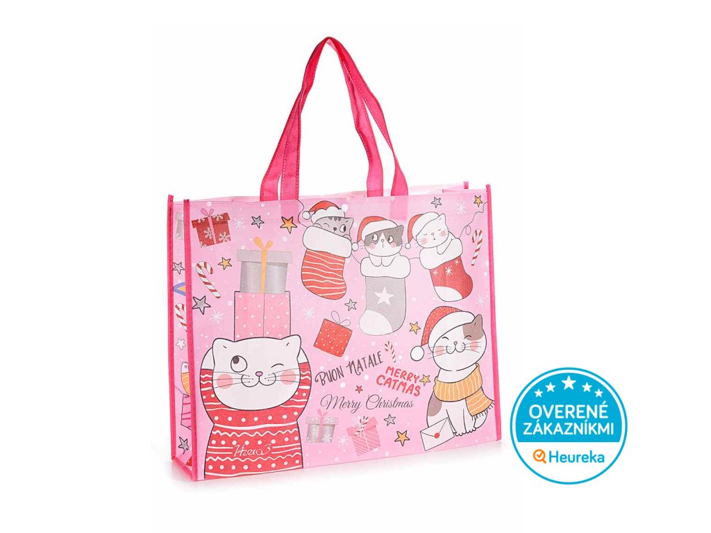 Ekologická priestranná nákupná či darčeková taška s vianočnými mačičkami, v ružovom alebo bledomodrom prevedení, s dlhšími ušami pre pohodlné nosenie cez rameno. Tieto mačičky postrážia vaše darčeky a unesú aj veľký vianočný nákup.