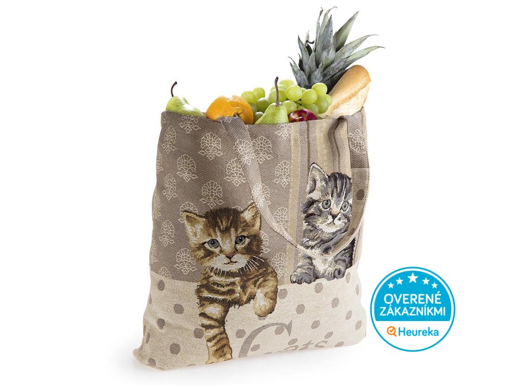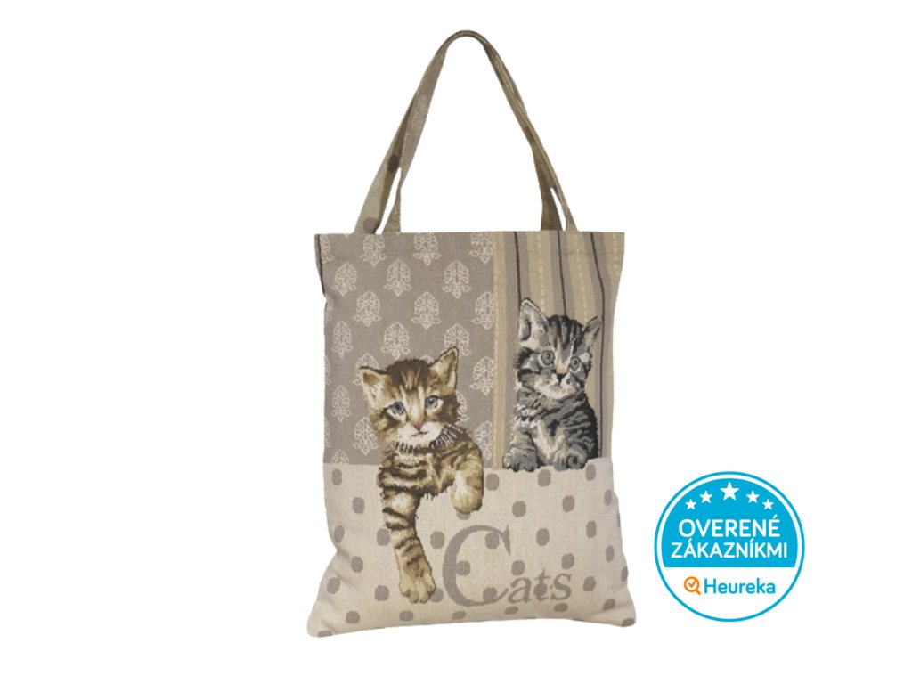 Veľká nákupná taška cez rameno z pevného gobelínu s výšivkou dvoch zvedavých mačiatok. Perfektná do práce, do mesta aj na nákupy.